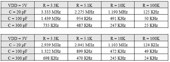 ◆ 建议选用33pf电容作为RC震荡电容,1~8MHz阻容搭配见下表(VDD=5V):