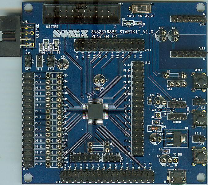 配合SN-LINK-V3可以直接进行SN32F768B MCU程序开发。该Kit已将所有功能的I/O都拉出来供给用户应用。