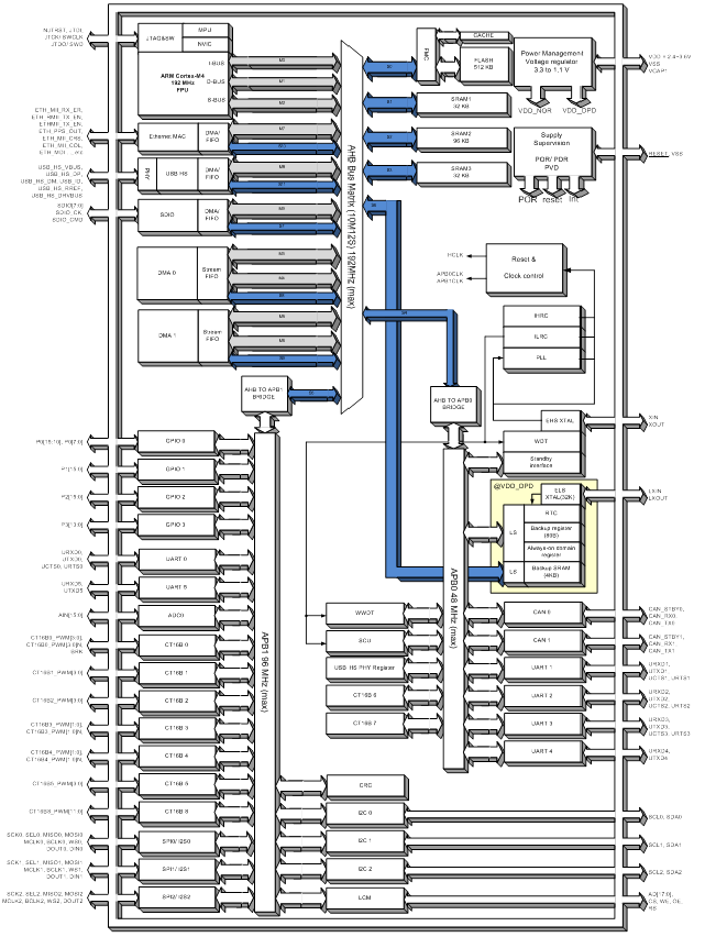 SN34F280 系列单片机是一款全新以先进Flash ROM制程设计的低功耗、高效能产品,以ARM Cortex ™-M4F 为核心,工作电压介于2.4V~3.6V,主频高达192MHz。SN34F280系列单片机IC结构一流,包括512KB Flash ROM程序内存、160KB RAM程序内存、巢状向量中断控制单元(NVIC)、九组16位定时器、通讯接口包括三组I2C、三组SPI、六组UART、三组I2S、USB 2.0高速接口、两组CAN 2.0A/B、支持SDIO、LCD-TFT(8080)接口、Ethernet MAC 10/100Mbps控制器、CRC、DMA,以及16+2信道12位SAR ADC。SN34F280系列单片机拥有许多系统时钟来源,包括内部12MHz RC震荡器、内部32KHz RC 震荡器、外部高/低速crystal震荡器和内部PLL. 在此Flash ROM 平台下, SN34F280 系列单片机内置在线编程功能(ISP),可扩展为EEPROM应用。强大的功能、高可靠性和低功耗可以在电池场合轻松应用。
