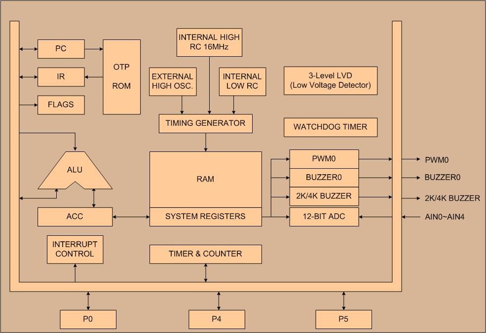 RC振荡器作为系统时钟,和一个由程控的低速RC振荡器作为低速模式的时钟源。
