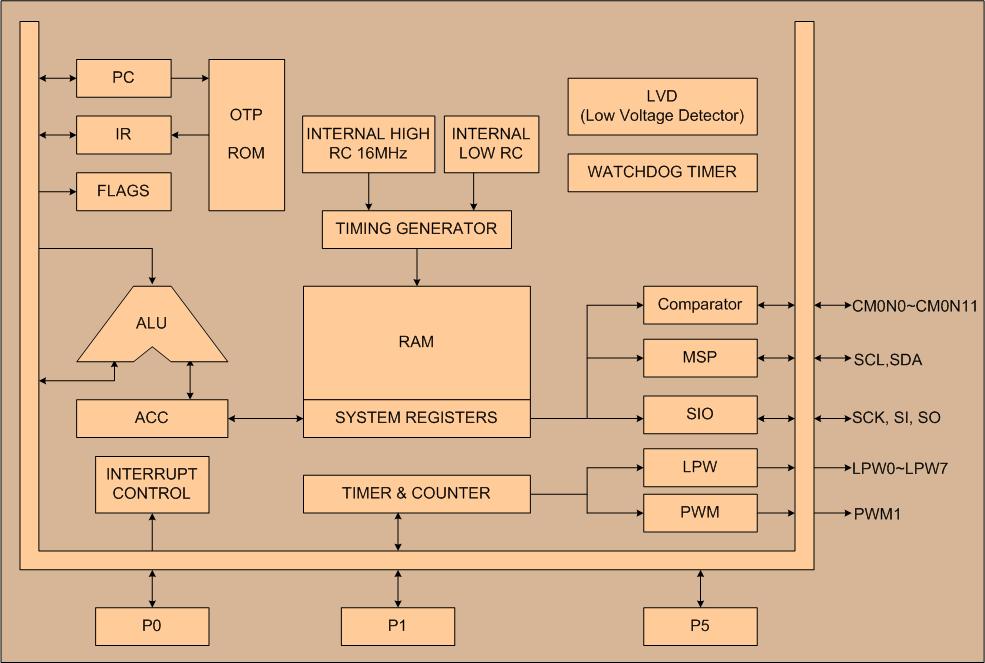 (TC0),一个看门狗定时器,6个中断源(T0,TC1,INT0,CM0,SIO,MSP),1组独立可编程的PWM (PWM1),12通道比较器,一组SIO接口,一组MSP