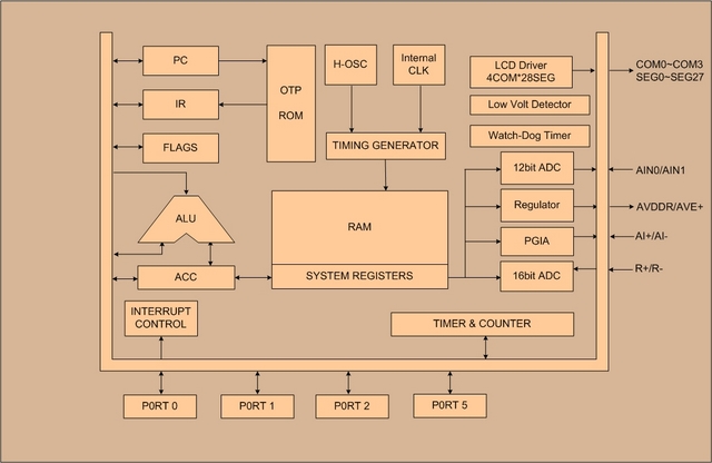 ADC,16位Delta-Sigma ADC,1个PGIA,1个regulator, 1个完整的LCD驱动(4-common * 28-segments LCD面板),和8层堆栈缓存器。此外,SN8P1989内置双时钟系统:高速时钟和低速时钟。高速时钟的系统时钟源由外部振荡器(包括晶体/陶瓷振荡器、RC和和外部时钟输入)或者内置16MHz高速RC振荡器(IHRC