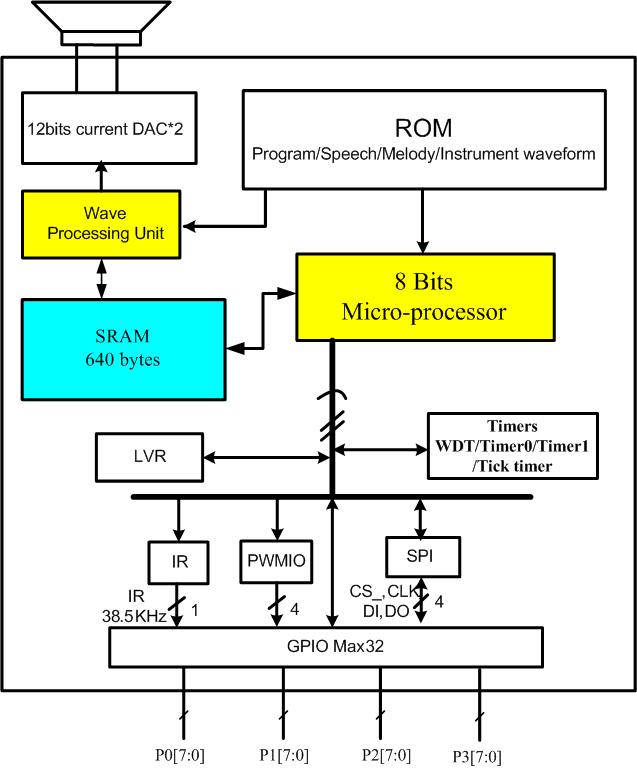 It is a multi-channel speech controller and it is an 8-bit single chip microprocessor. It contains RAM, ROM, I/Os, interrupt function and 12-bit high-quality DA. For CPU power consideration, this chip not only built-in an 8-Bits CPU but also a Wave Processing Unit (WPU). All the wave-table melody play are handled by this WPU, CPU should set-up the property initial value before wave-table melody playing. Besides, according to improvement of the CPU power, most of standard MIDI format can be acceptable through the MIDI to Melody convert software.