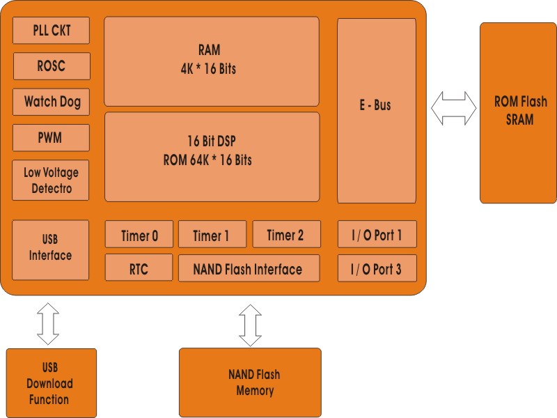 The standard microprocessor interface allows SNC712 to extend its memory capability, or connect external device. We also built-in a Low Voltage Detector circuit for power management and a USB 1.1 interface (support mass-storage class) for communication with PC.
