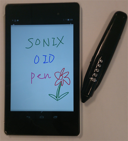 The Sonix SN95300FG Optical Identification Device utilizes optics to read unique invisible [micro-sized] dot patterns printed on almost any traditional paper stock. The data read from the printed codes by an OID is transferred to a computer, smart device, or self-contained digital content controller allowing printed material to interact with sound, animations, or control. Pointing an OID at words/sentences/pictures on a page in a book can trigger sounds or translate/repeat words/phrases for interactive reading or enhanced educational experiences. The Sonix OID can be utilized as an innovative real time input control device supporting digital handwriting applications. Notes taken on paper are digitally saved as they are written or could be projected from a PC. Handwriting recognition aiding students in the skills of written letters or drawing shapes. The Sonix SN95300FG OID provides the most advanced solution to date for digital video learning, digital content reading, and digital handwriting applications.