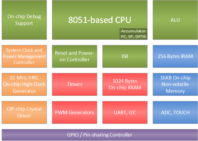 SN8F5752 is an 8-bit architecture microcontroller which compatible with MCS-51 instruction set. It runs at up to 12.1 times faster than the original 8051 at the same frequency. Meanwhile, its advanced semiconductor technology provides a wide range operation voltage, from 1.8 V to 5.5 V, and working temperature between -40°C and 85°C at 8MHz CPU clock rate.The microcontroller builds in 16 KB flash memory (IROM), 256 bytes internal RAM (IRAM) and 1024 bytes on-chip external RAM (XRAM).16 input channels/12-bit resolution ADC, 8-ch 1/2 VDD BIAS, 23 touch channels, 2-set PWM generator, interfaces (2 UARTs, I2C) and 3set 16-bit timers were designed to fit in the vast majority of consumer electronics, home automation and motor control applications.