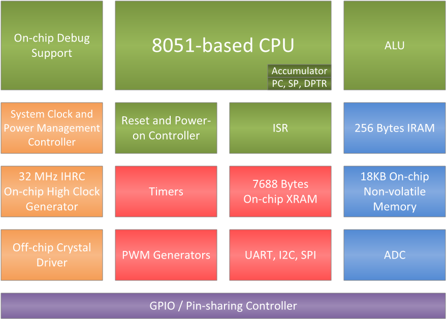 SN8F5762 is an 8-bit architecture microcontroller which compatible with MCS-51 instruction set. It runs at up to 12.1 times faster than the original 8051 at the same frequency. Meanwhile, its advanced semiconductor technology provides a wide range operation voltage, from 1.8 V to 5.5 V, and working temperature between -40°C and 105°C at 24 MHz CPU clock rate.The microcontroller builds in a 18 KB flash memory (IROM), 256 bytes internal RAM (IRAM) and 768 bytes on-chip external RAM (XRAM). Furthermore, a 12 input channels/12-bit resolution ADC, 2-set PWM generator, interfaces (2 UARTs, I2C, SPI) and 16-bit timers were designed to fit in the vast majority of consumer electronics, home automation and motor control applications.
