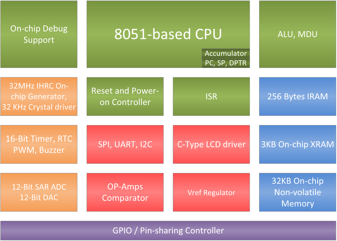 SN8F5848 is an 8-bit architecture microcontroller which compatible with MCS-51 instruction set. It runs at up to 12.1 times faster than the original 8051 at the same frequency. Meanwhile, its advanced semiconductor technology provides a wide range operation voltage, from 1.8 V to 3.6 V, and working temperature between -40°C and 85°C at 32 MHz CPU clock rate.The microcontroller builds in a 32 KB flash memory (IROM), 256 bytes internal RAM (IRAM) and 3 KB on-chip external RAM (XRAM). A Hardware MDU dramatically improves mathematical operations performance. Furthermore, a 10 input channels 12-bit resolution SAR ADC, Two 12-bit resolution DAC, 4*34 or 6*32 LCD driver (136~192 dots), Two OP-Amps and comparator, One Programmable Gain Instrument Amplifier, One reference voltage Regulator (AVREFH), Three 16-Bit Timer/Counter with Auto reload, PWM Output function, One 8-Bit base Timer for RTC , Communication interfaces (UART*1, SPI*1, I2C*1) to fit in the vast majority of consumer electronics, Pulse Oximeter、Blood Gluscose、Measurement、and Medical Measurement Applications.