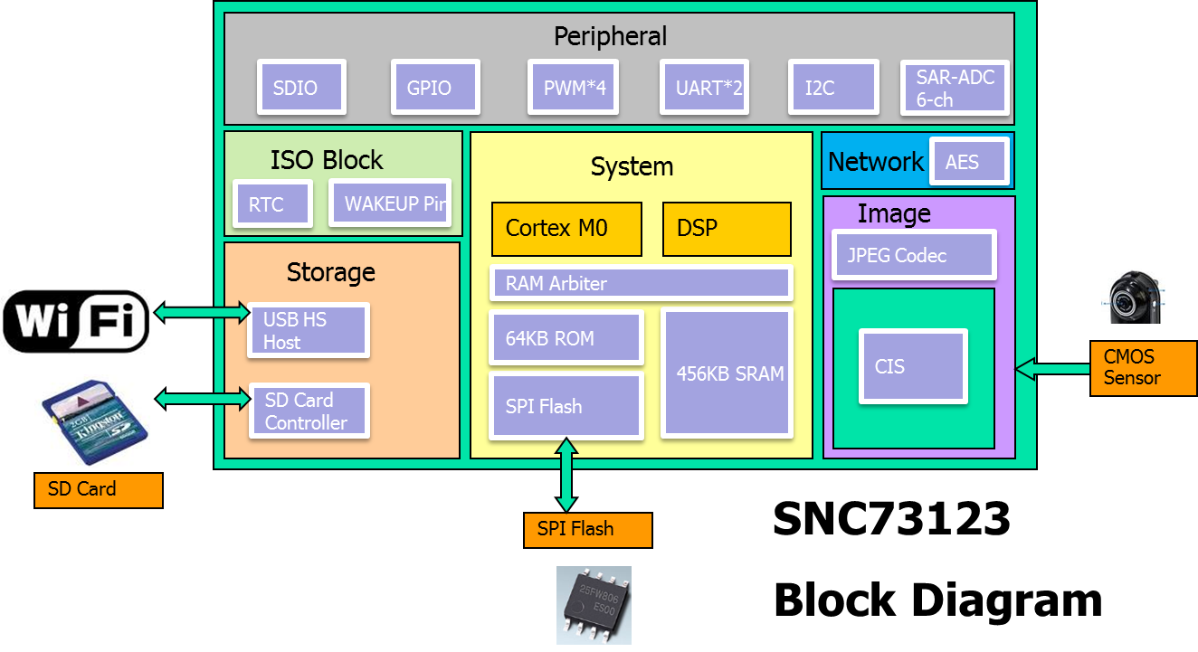 In SNC7312, other peripherals are embedded; including TFT LCD Interface, SPI master/slave interface, SD/MMC controller, SDIO Host, USB2.0 high speed device/Host, audio ADC, Stereo DAC, builded-in amplifer and 6-ch SAR ADC.