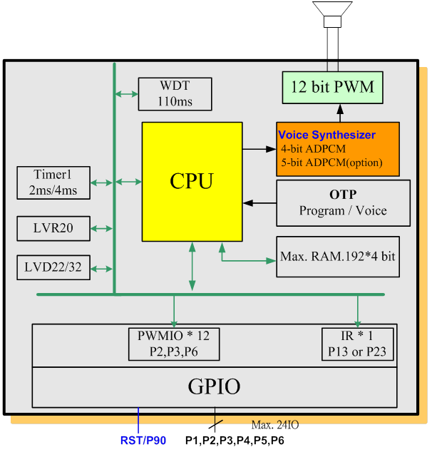 SNC27P250 is a one-channel voice synthesizer IC with 12-bit PWM direct drive circuit. It built in a 4-bit tiny controller with one input port and 24 I/O ports. By programming through the tiny controller in SNC27P250, user’s varied applications including voice section combination; key trigger arrangement, output control, and other logic functions can be easily implemented.