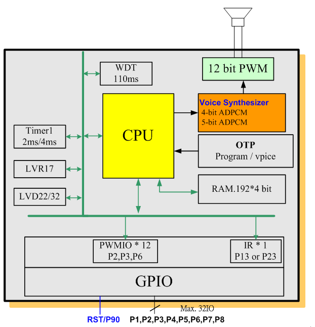 SNC27P1000 is a one-channel voice synthesizer IC with 12-bit PWM direct drive circuit.