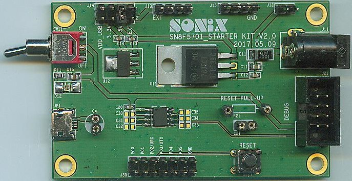 Assort with SN-LINK-V3 and support emulate SN8F5701 MCU. This Kit can provide the I/O ports for function test and other applications of users.