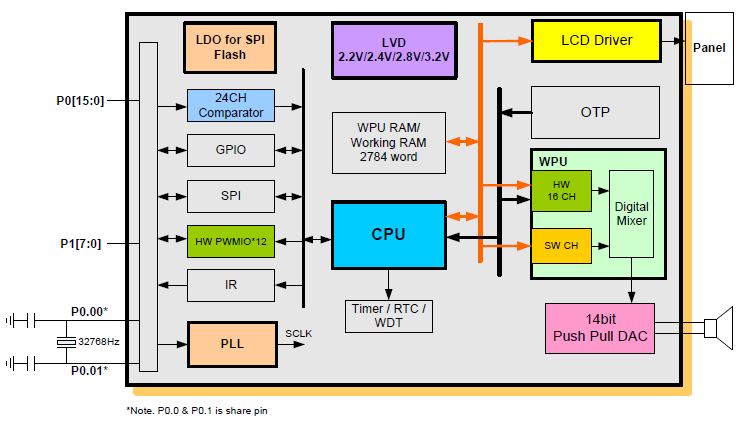 The SNL86P is 16-bit LCD controller series with embedded multi-channel 16-hardware Voice/MIDI Wave Processing Unit (WPU). In addition to having multi-channel hardware channels, one software high quality voice channel with SONiX HQDPCM/Audio32 algorithm is provided.