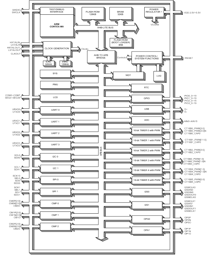 SN32F280 series 32-bit micro-controller is a new series of extremely Low Power Consumption and High Performance MCU powered by ARM Cortex-M0 processor with Flash ROM architecture. SN32F280 series MCU is high performance and wide operating range (2.5V~5.5V, 48 MHz maximum frequency). The device is designed with the excellent IC structure including the program memory up to 128KB Flash ROM, data memory of 32KB RAM, Nested Vectored Interrupt Controller (NVIC), six 16-bit timers, I2C, SPI, UART, I2S , Full Speed USB 2.0 SIE, PS/2 mode, EBI interfaces, 4x40/6x38/7x37/6x36 LCD drive, 16+3-channel 12-bit SAR ADC, three comparators, two OP amplifiers, 24 capacitive touch keys, CRC, and flexible operating modes. There are several system clock sources, including internal 12MHz RC oscillator, internal 32KHz RC oscillator, external High Speed crystal, external Low Speed crystal, and PLL. Under Flash ROM platform, SN32F280 series MCU builds in in-system-programming (ISP) function extending to EEPROM emulation. Powerful functionality, high reliability and low power consumption can apply to battery level application easily.