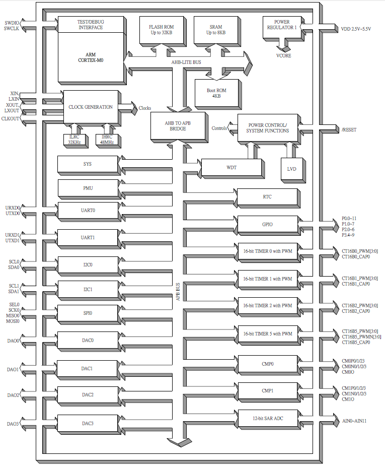 SN32F800 series 32-bit micro-controller is a new series of extremely Low Power Consumption and High Performance MCU powered by ARM Cortex-M0 processor with Flash ROM architecture. SN32F800 series MCU is high performance and wide operating range (1.8V~5.5V, 60 MHz maximum frequency). The device is designed with the excellent IC structure including the program memory up to 32KB Flash ROM, data memory of 8KB RAM, Nested Vectored Interrupt Controller (NVIC), four 16-bit timers, I2C, SPI, UART, 12+3-channel 12-bit SAR ADC, 4-channel 12-bit DAC, two comparators, CRC, and flexible operating modes. There are several system clock sources, including internal 48MHz RC oscillator, internal 32KHz RC oscillator, external High Speed crystal, external Low Speed crystal, and PLL. Under Flash ROM platform, SN32F800 series MCU builds in in-system-programming (ISP) function extending to EEPROM emulation. Powerful functionality, high reliability and low power consumption can apply to battery level application easily.