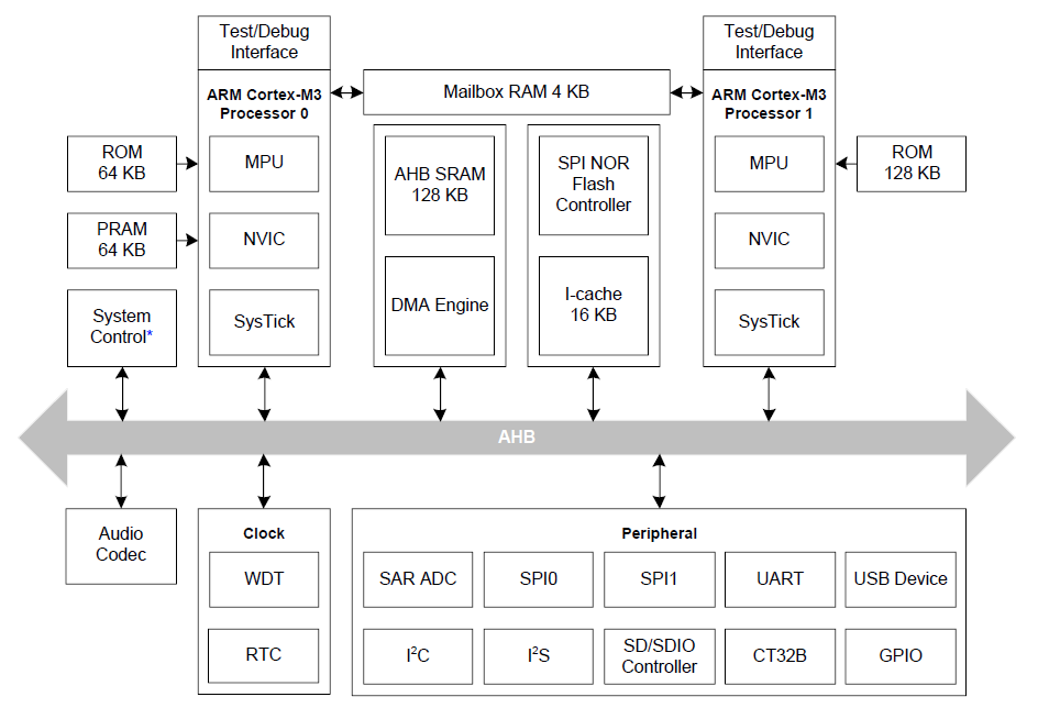 The SNC7340 series has two 32-bit ARM® Cortex®-M3 processors in symmetric dual-core architecture. Each of the two cores controls respective designated peripherals, cooperates with the other, and can be independently programmed. The two processors of the SNC7340 series operate at a frequency of up to 96 MHz individually. Supporting RAM array with data bandwidth of up to 5 GB/sec and deep power-down mode consuming less than 1 μA, the SNC7340 series is designed for high performance and low power consumption embedded applications.
