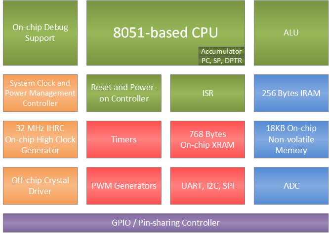 The microcontroller builds in a 18 KB flash memory (IROM), 256 bytes internal