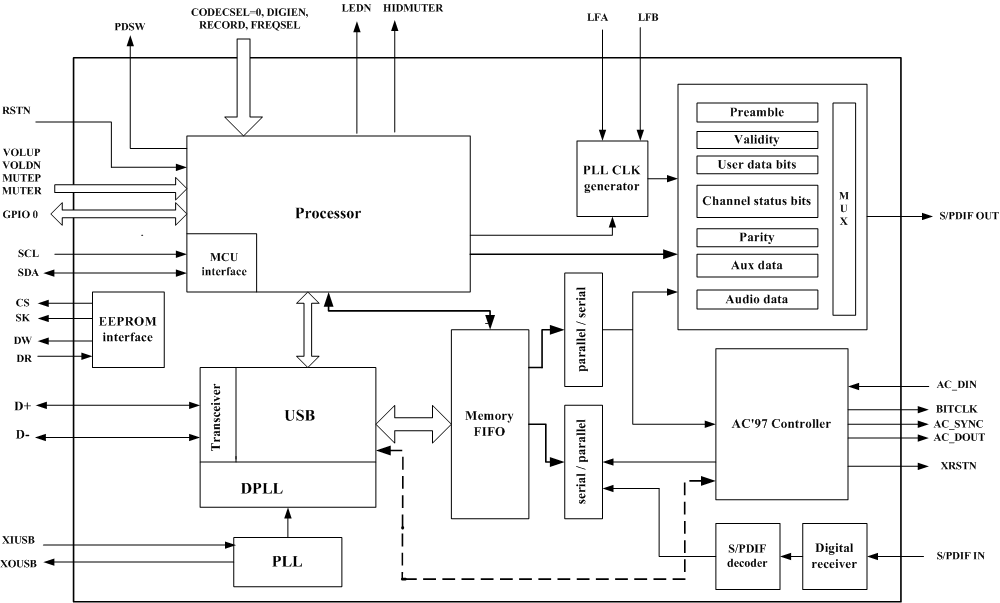 松翰高效率的音效控制晶片SN11220APF是一個支援8K,11.025KHZ,16KHZ,22.05KHZ,24K,32K,44.1K,48K八種取樣頻率類比撥放/錄音, 可根據PC音源動態調整頻率,適合應用在USB立體聲撥放/錄音,SN11220APF架構上已完整地支援 1個控制PIPE,兩個即時PIPE和1個中斷 PIPE 可說是一個應用相當廣泛的音源控制器