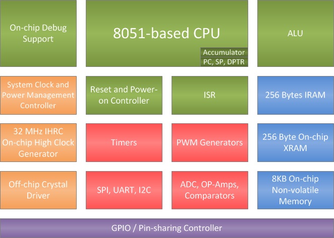 SN8F570321 is an 8-bit architecture microcontroller which compatible with MCS-51 instruction set. It runs at up to 12.1 times faster than the original 8051 at the same frequency. Meanwhile, its advanced semiconductor technology provides a wide range operation voltage, from 1.8 V to 5.5 V, and working temperature between -40°C and 85°C at 32 MHz CPU clock rate.The microcontroller builds in a 8 KB flash memory (IROM), 256 bytes internal RAM (IRAM) and 256 bytes on-chip external RAM (XRAM). Furthermore, a 11 input channels/12-bit resolution ADC, 1-set of OP-Amps and 1-set comparators, single PWM generator, interfaces (UART, SPI, I2C) and 16-bit timers were designed to fit in the vast majority of consumer electronics, home automation and motor control applications.