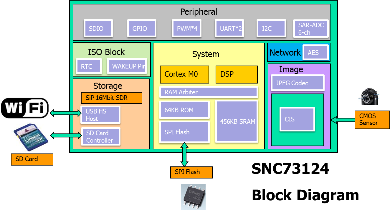 In SNC7312, other peripherals are embedded; including TFT LCD Interface, SPI master/slave interface, SD/MMC controller, SDIO Host, USB2.0 high speed device/Host, audio ADC, Stereo DAC, builded-in amplifer and 6-ch SAR ADC.