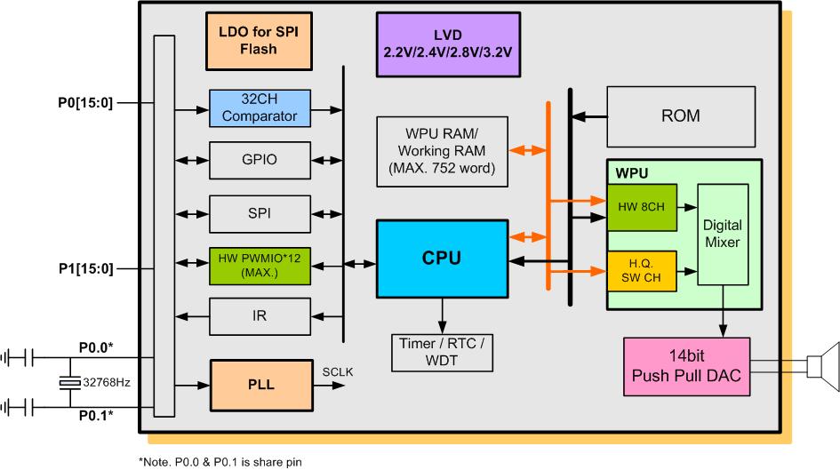 The SNC86280A 12MHz 16-bit RISC controller series with embedded multi-channel 8 hardware Voice/MIDI Wave Processing Unit (WPU). In addition to having multi-channel hardware channels, one software high quality voice channel with SONiX HQDPCM algorithm is provided.