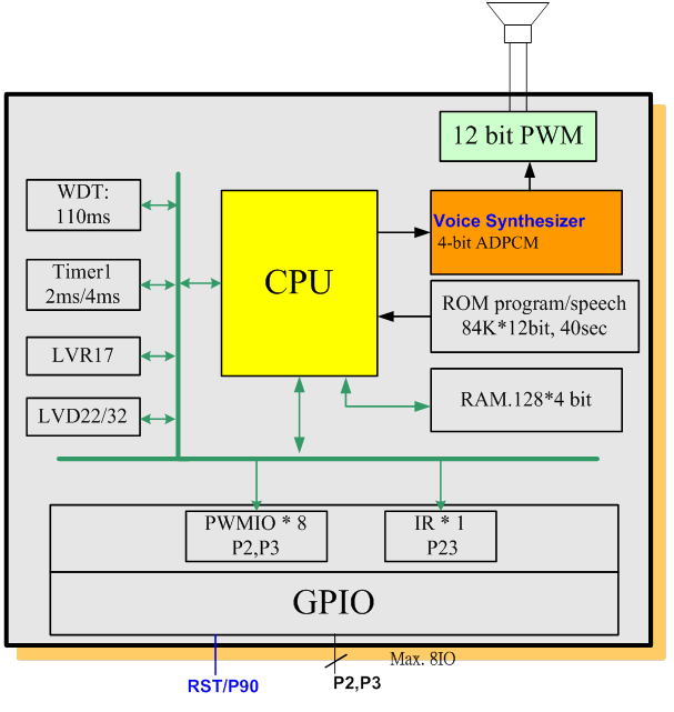 SNC27P030 is a one-channel voice synthesizer IC with 12-bit PWM direct drive circuit.