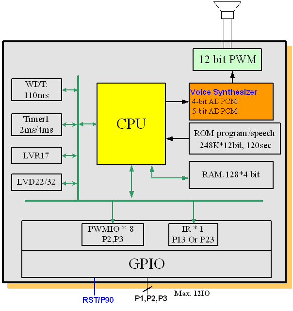 SNC27P120 is a one-channel voice synthesizer IC with 12-bit PWM direct drive circuit.