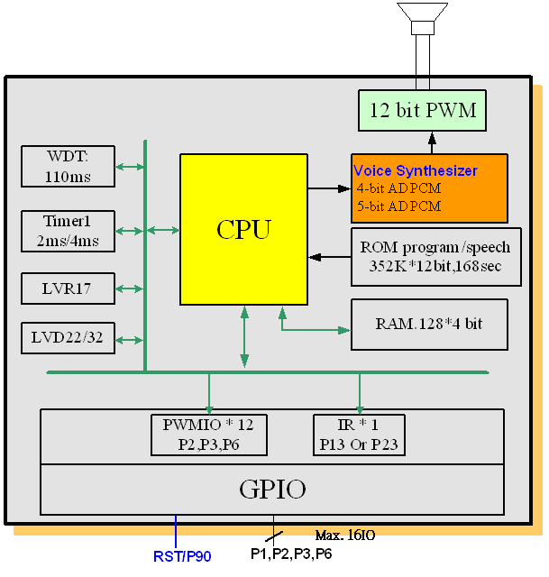 SNC27P061 is a one-channel voice synthesizer IC with 12-bit PWM direct drive circuit. It built in a 4-bit tiny controller with one input port and 16 I/O ports. By programming through the tiny controller in SNC27P061, user’s varied applications including voice section combination; key trigger arrangement, output control, and other logic functions can be easily implemented.