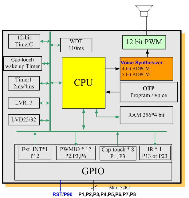 It built in a 4-bit tiny controller with one input port and 32 I/O ports. By programming