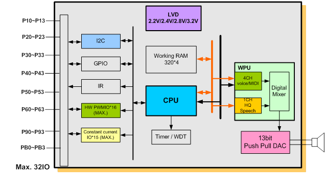 The SNC32KP is a 4bit tiny controller series with embedded 5 channel hardware Voice/MIDI Wave Processing Unit (WPU).By programming through the tiny controller in SNC32KPxxx, user’s varied applications including voice section combination; key trigger arrangement, output control, and other logic functions can be easily implemented