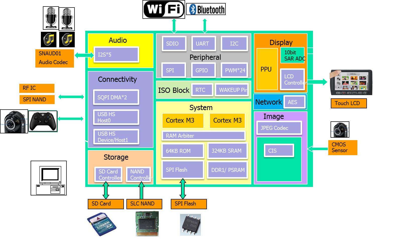 Furthermore, the SNC7320 Series provides two I2S controllers for external audio device connections.