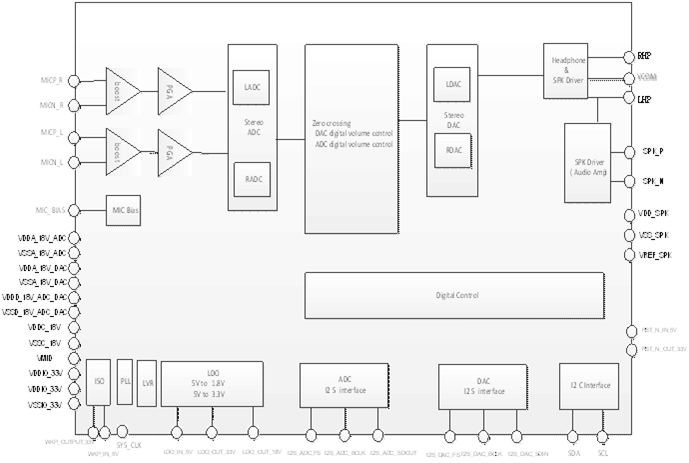 headphone driver, audio amplifier, fractional PLL and LDOs.