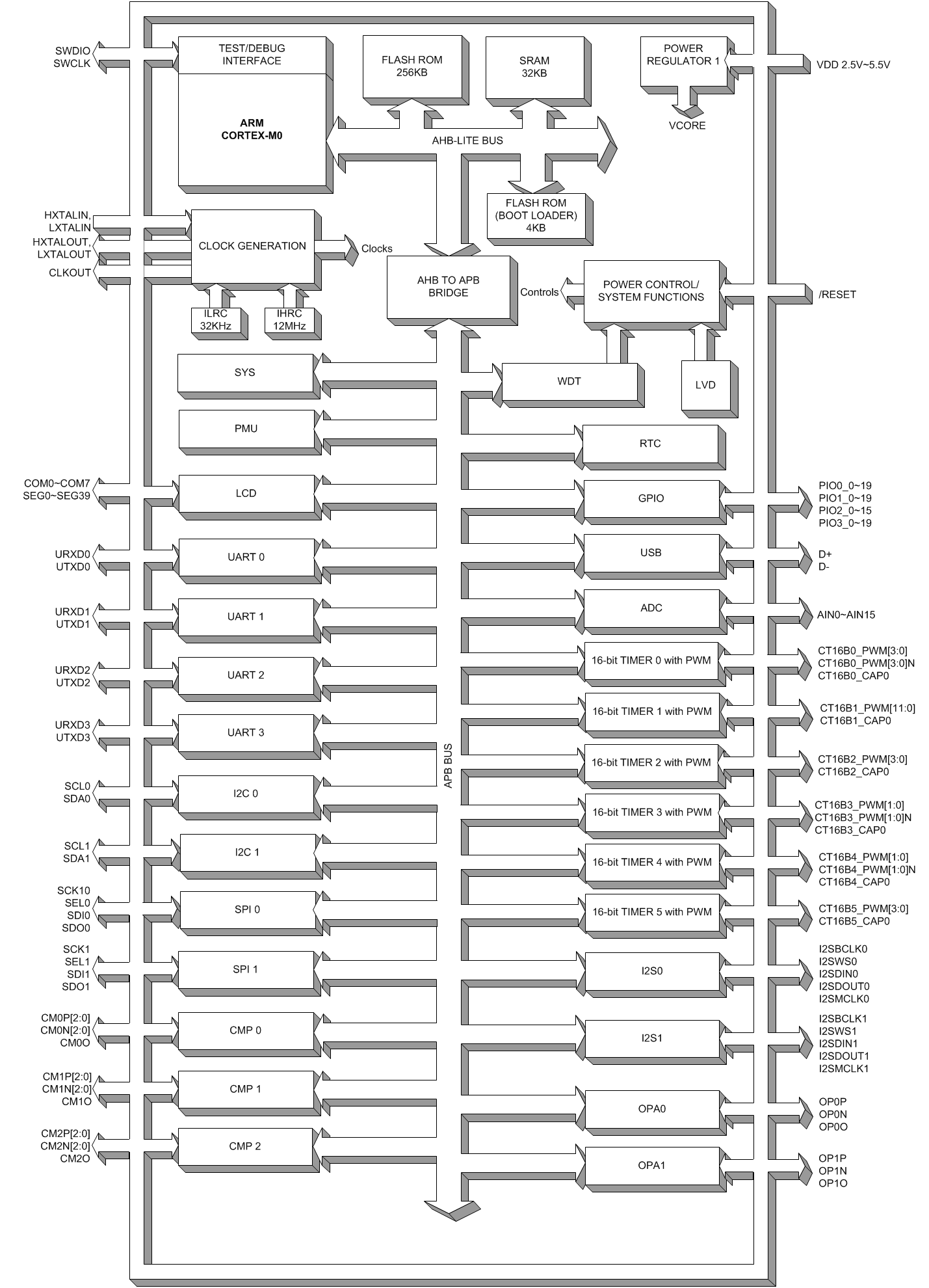 SN32F290 series 32-bit micro-controller is a new series of extremely Low Power Consumption and High Performance MCU powered by ARM Cortex-M0 processor with Flash ROM architecture. SN32F290 series MCU is high performance and wide operating range (2.5V~5.5V, 48 MHz maximum frequency). The device is designed with the excellent IC structure including the program memory up to 256KB Flash ROM, data memory of 32KB RAM, Nested Vectored Interrupt Controller (NVIC), six 16-bit timers, I2C, SPI, UART, I2S , Full Speed USB 2.0 SIE, PS/2 mode, EBI interfaces, 4x40/6x38/7x37/6x36 LCD drive, 16+3-channel 12-bit SAR ADC, three comparators, two OP amplifiers, 24 capacitive touch keys, CRC, and flexible operating modes. There are several system clock sources, including internal 12MHz RC oscillator, internal 32KHz RC oscillator, external High Speed crystal, external Low Speed crystal, and PLL. Under Flash ROM platform, SN32F290 series MCU builds in in-system-programming (ISP) function extending to EEPROM emulation. Powerful functionality, high reliability and low power consumption can apply to battery level application easily.
