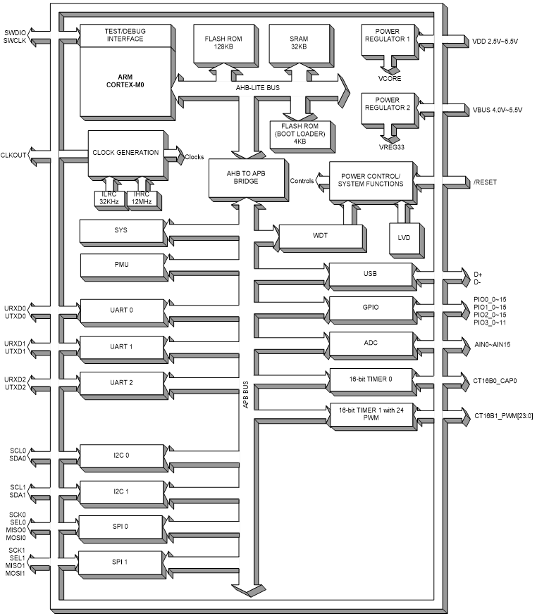 SN32F240C series 32-bit micro-controller is a new series of extremely Low Power Consumption and High Performance MCU powered by ARM Cortex-M0 processor with Flash ROM architecture. SN32F240C series MCU is high performance and wide operating range (2.5V~5.5V, 48 MHz maximum frequency). The device is designed with the excellent IC structure including the program memory up to 128KB Flash ROM, data memory of 32KB RAM, Nested Vectored Interrupt Controller (NVIC), two 16-bit timers, I2C, SPI, UART interfaces, Full Speed USB 2.0 SIE, PS/2 mode, 16+1-channel 12-bit SAR ADC and flexible operating modes. There are several system clock sources, including internal 12MHz RC oscillator, internal 32KHz RC oscillator, and PLL. Under Flash ROM platform, SN32F240C series MCU builds in in-system-programming (ISP) function extending to EEPROM emulation. Powerful functionality, high reliability and low power consumption can apply to battery level application easily.