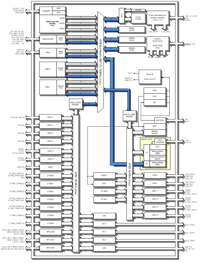 SN34F780 系列单片机是一款全新以先进Flash ROM制程设计的低功耗、高效能产品,以ARM Cortex ™-M4F 为核心,工作电压介于2.4V~3.6V,主频高达192MHz。SN34F780系列单片机IC结构一流,包括512KB Flash ROM程序内存、160KB RAM程序内存、巢状向量中断控制单元(NVIC)、九组16位定时器、通讯接口包括三组I2C、三组SPI、六组UART、三组I2S、两组CAN 2.0A/B、支持SDIO、LCD-TFT(8080)接口、Ethernet MAC 10/100Mbps控制器、CRC、DMA,以及16+2信道12位SAR ADC。SN34F780系列单片机拥有许多系统时钟来源,包括内部12MHz RC震荡器、内部32KHz RC 震荡器、外部高/低速crystal震荡器和内部PLL. 在此Flash ROM 平台下, SN34F780 系列单片机内置在线编程功能(ISP),可扩展为EEPROM应用。强大的功能、高可靠性和低功耗可以在电池场合轻松应用。