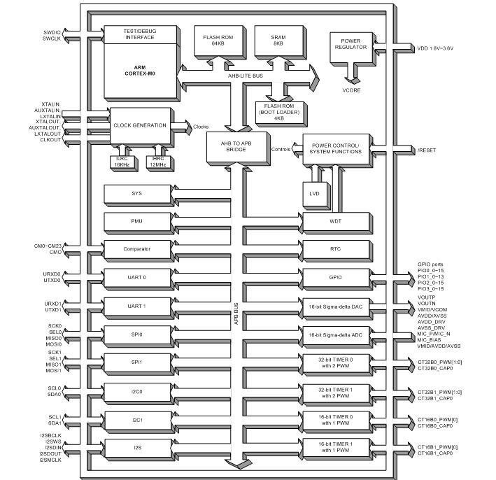SN32F100 series 32-bit micro-controller is a new series of extremely Low Power Consumption and High Performance MCU powered by ARM Cortex M0 processor with Flash ROM architecture. SN32F100 series MCU is high performance and wide operating range (1.8V~3.6V, 50 MHz maximum frequency). The device is designed with the excellent IC structure including the program memory up to 64KB Flash ROM, data memory of 8KB RAM, Nested Vectored Interrupt Controller (NVIC), Audio Codec, 24-channel Comparator, two 16-bit timers, two 32-bit timers, I2C, SPI, UART, I2S interfaces, and flexible operating modes. There are several system clock sources, including internal 12MHz RC oscillator, internal 16KHz RC oscillator, external High Speed crystal, external Audio High Speed crystal, external Low Speed crystal, and PLL. Under Flash ROM platform, SN32F100 series MCU builds in in-system-programming (ISP) function extending to EEPROM emulation. Powerful functionality, high reliability and low power consumption can apply to battery level application easily.
