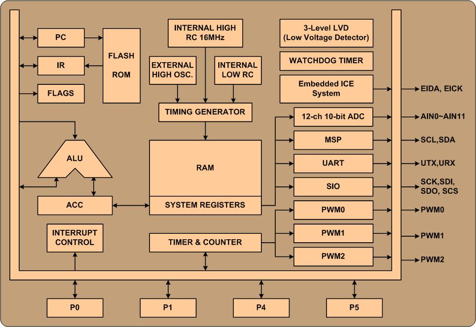 Flash ROM, data memory of 512-bytes RAM, 8-level stack buffers, multi-interrupt vector,
