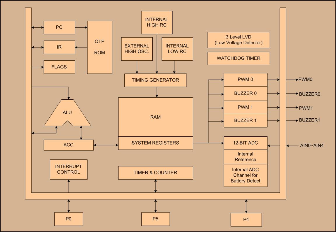 The SN8P2711B is a RISC-like high performance and low power consumption 8-bit micro-controller. One clock per instruction cycle (1T) architecture will provide up to 16MIPS computation power. Also, the high EFT (Electrical Fast Transients) protection capability let this device is suitable for high noisy industrial application. The device is designed with the excellent IC structure including the program memory up to 1K-word OTP ROM, data memory of 64-bytes RAM, two 8-bit timer counters (TC0, TC1), a watchdog timer, five interrupt sources (TC0, TC1, ADC, INT0, INT1), an 5+1 channel 12-bit ADC converter (one internal ADC channel for VDD measurement), two channels PWM output (PWM0, PWM1), two channels buzzer output (BZ0, BZ1) and 4-level stack buffers. There are four oscillator configurations to select for generating system clock, including High/Low Speed crystal, ceramic resonator or cost-saving RC. This device also includes an internal 16MHz RC oscillator for system clock and includes an internal low frequency RC oscillator for slow mode controlled by programming.