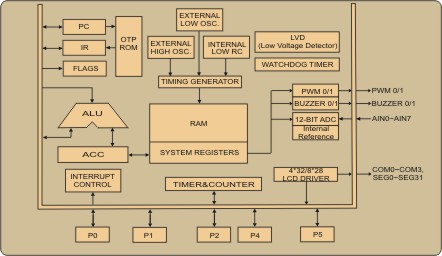 integrated LCD driver for 4-common x 32-segments and 8-common x 28-segments LCD panel, a 8-level stack register and 6-sources interrupts. In addition, the SN8P2808 is a dual clock system, i.e. high-speed