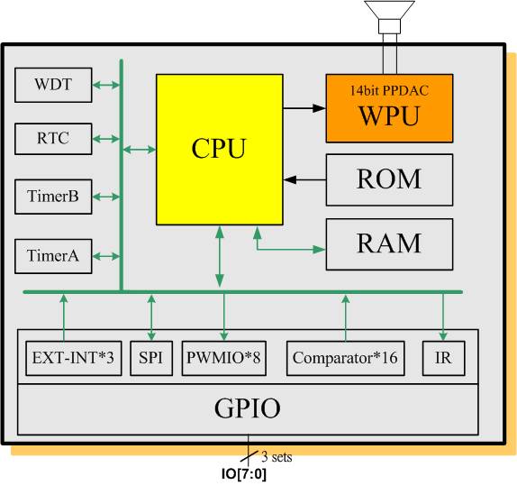 SNC81200S is a four-channel voice synthesizer IC with push-pull direct drive circuit. It built in a powerful 8-bit controller and 24 I/O pins. By programming through the controller in SNC81200S, user’s varied applications including voice section combination; key trigger arrangement, output control, and other logic functions can be easily implemented.