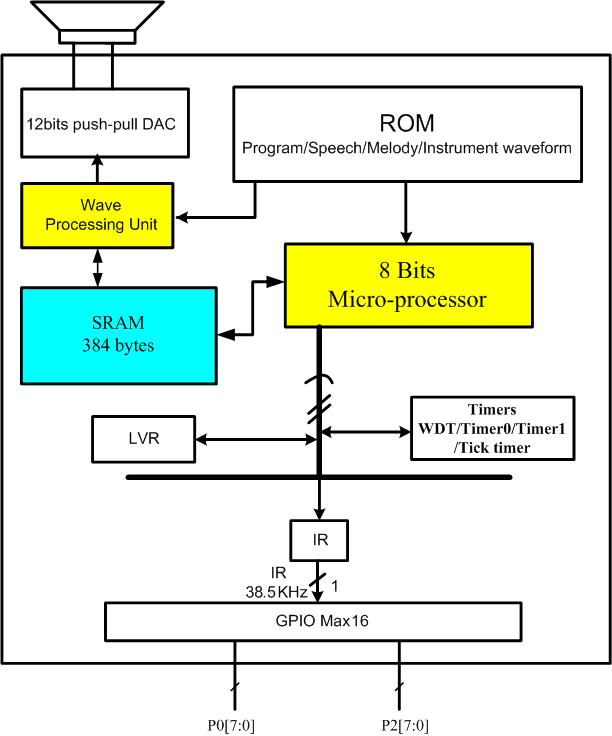 It is a multi-channel speech controller and it is an 8-bit single chip microprocessor. It contains RAM, ROM, I/Os, interrupt function and 12-bit high-quality DA. For CPU power consideration, this chip not only built-in an 8-Bits CPU but also a Wave Processing Unit (WPU). All the wave-table melody play are handled by this WPU, CPU should set-up the property initial value before wave-table melody playing. Besides, according to improvement of the CPU power, most of standard MIDI format can be acceptable through the MIDI to Melody convert software.