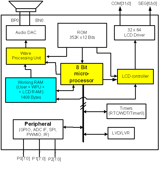 The SNL16168S is an 8-bit LCD controller embedded 2048 dots with B/W LCD driver. It contains an 8-bit CPU core, LCD Controller, Wave Processing Unit (WPU) and other primary functions for LCD games, Education Learning Aids (ELA).