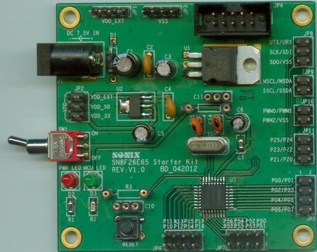 配合SN-LINK-V3可以直接進行26E65 MCU程式開發。該Kit已將所有功能的I/O都拉出來供給使用者應用。