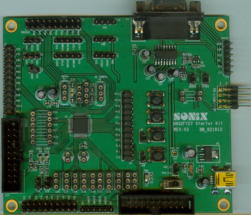 配合SN-LINK-V3可以直接進行SN32F727 MCU程式開發。該Kit已將所有功能的I/O都拉出來供給使用者應用。