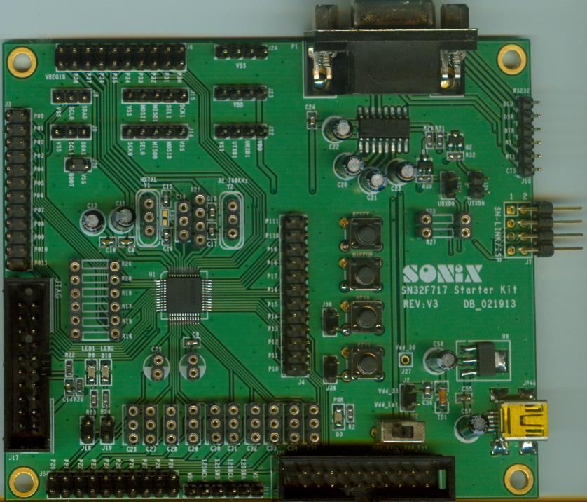 配合SN-LINK-V3可以直接進行SN32F717 MCU程式開發。該Kit已將所有功能的I/O都拉出來供給使用者應用。