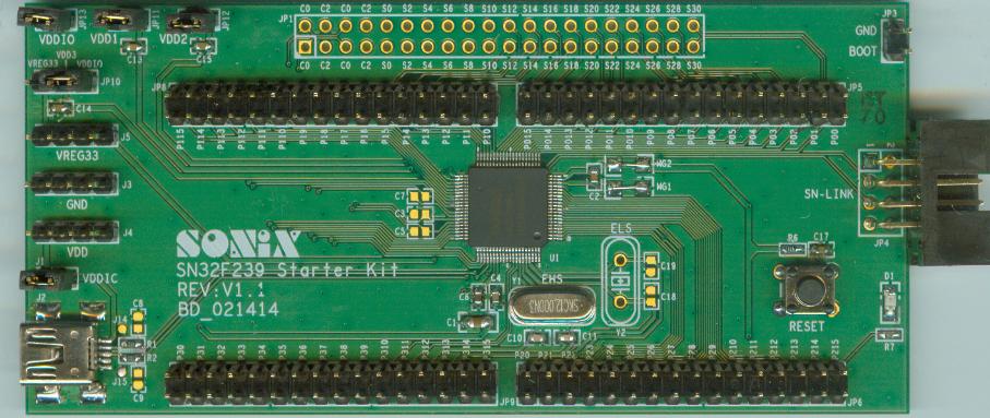 配合SN-LINK-V3可以直接進行SN32F239 MCU程式開發。該Kit已將所有功能的I/O都拉出來供給使用者應用。