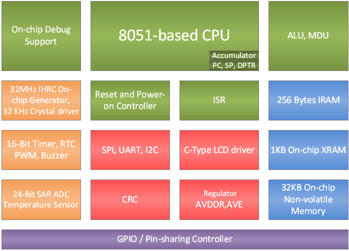 - ADC、1組可程式增益放大器(PGIA:x1~x128)、4*24或6*22的LCD驅動器 (96~132 dots)、2 組參考電壓穩壓器 (AVDDR,AVE)、1組比較器電路、3組16位元計數器(timer)、一組8位元基本計時器T0,帶有RTC(即時時鐘)功能和UART*1、SPI*1、I2C*1的通訊界面,以滿足消費電子產品、耳溫槍、體溫計、血糖機和醫療量測等運用場合。