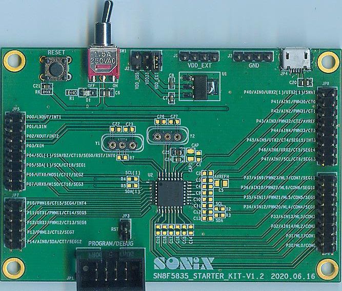 配合SN-LINK-V3 可以直接進行SN8F5835 MCU程式開發。該Kit已將所有功能的I/O都拉出來供給使用者應用。