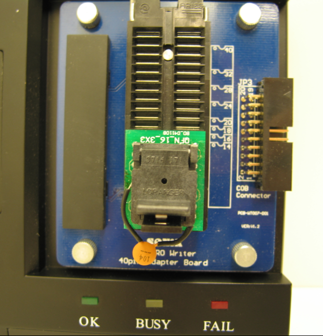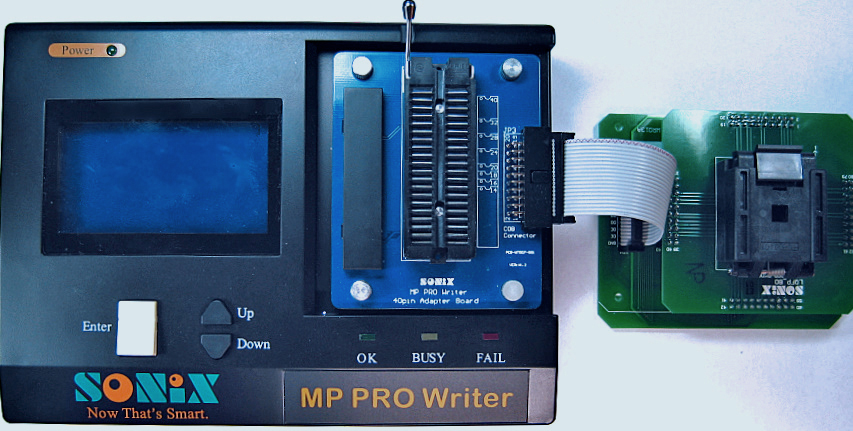 先將40 PIN Adapter board至於MP PRO,再透過20PIN排線接至型號相同之Transition Board上,再將MCU放置於Socket即可燒錄。
