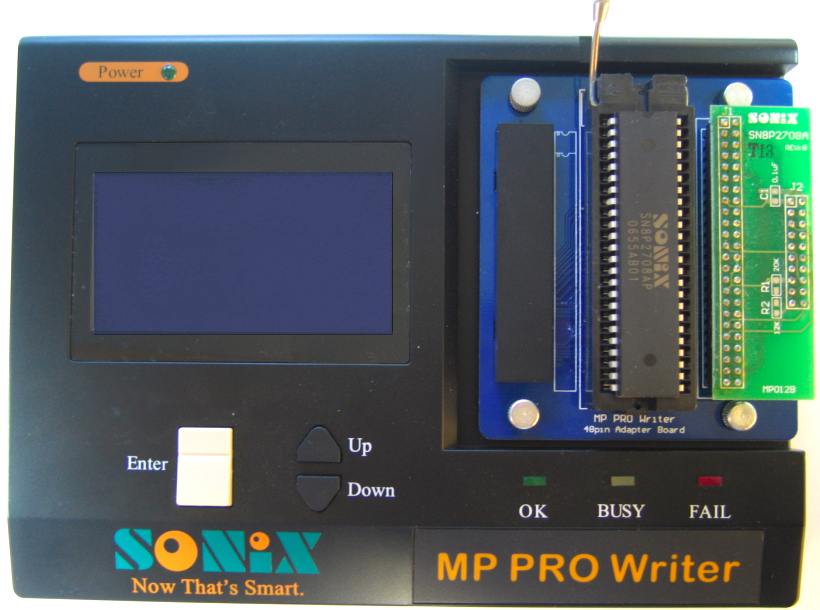 先將48 PIN Adapter board至於MP PRO,同時插入與MCU型號相同之Transition Board,燒錄軟體選擇欲燒錄之型號並將MCU放置於MP PRO上的Text Tool即可燒錄。